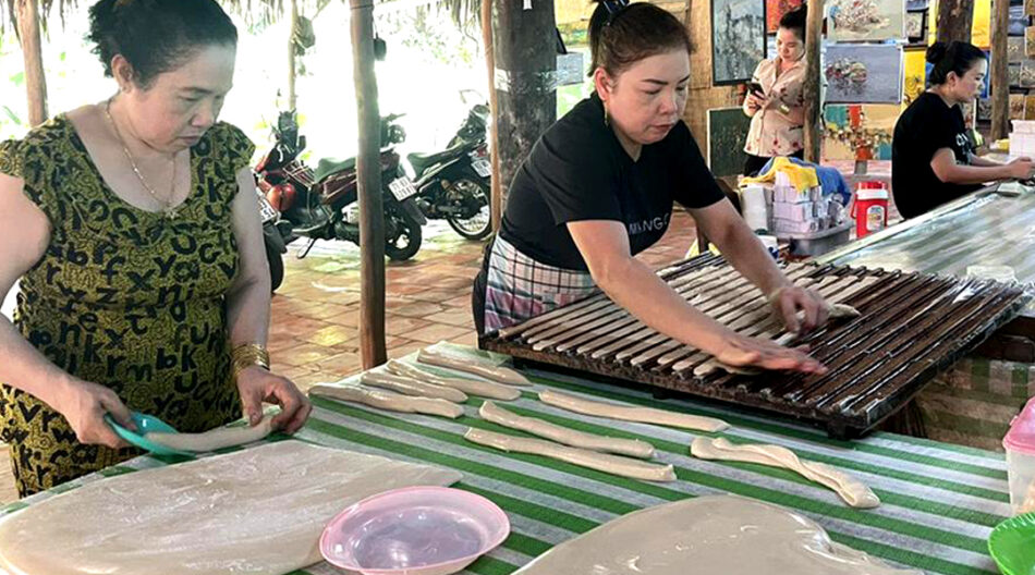 After that our big boat will cross the Mekong river (boat takes 20 minutes) to reach the Vinh Long province. From there you will be taught how to make Vietnamese pancakes and spring rolls. You will enjoy your own creations at lunch.